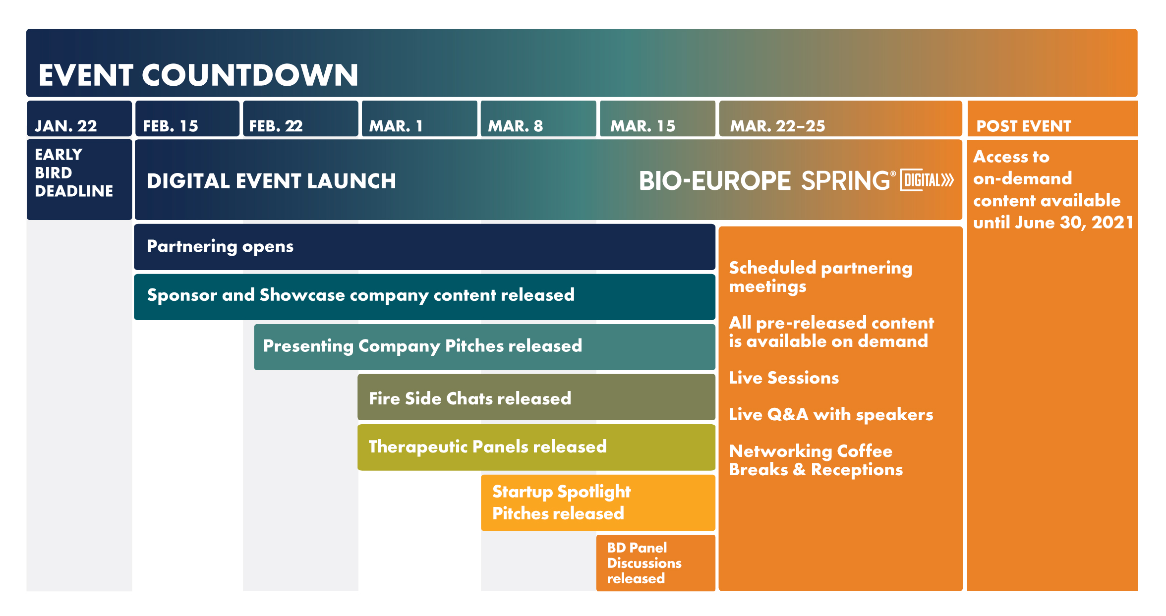 The fifteenth annual BIO-Europe Spring® premier springtime partnering conference will be held March 22-25 in a fully digital format. It will include on-demand early access to the company pitches, program sessions, and sponsor and showcase company content up to five weeks prior to the live event for the best possible networking and meeting decisions once partnering begins.