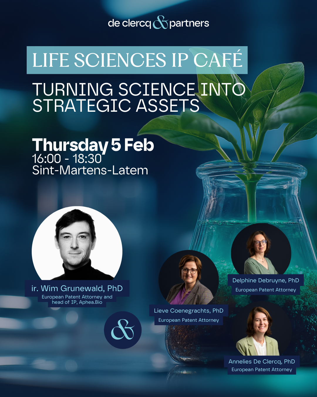 We are pleased to invite you to our next IP Café, organised by De Clercq & Partners: to share insights and practical experience to transform scientific ideas into valuable strategic IP assets, combining short presentations with interactive interview-style discussions.