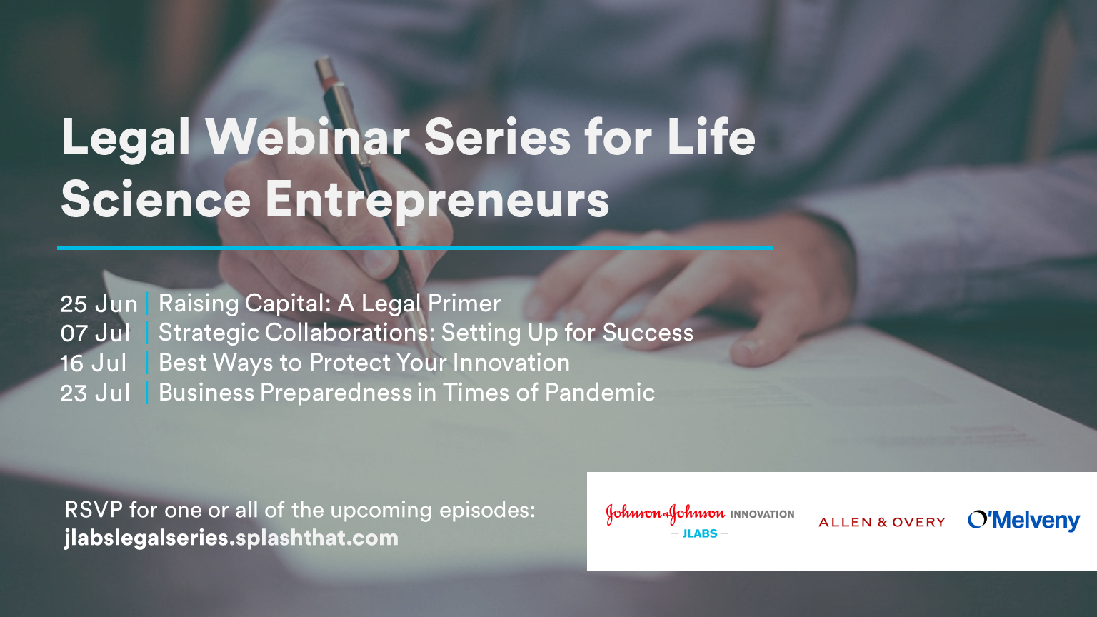 Founders of start-ups may face many new challenges in the evolving start-up environment due to the COVID-19 pandemic. While founders need to focus on fundraising, science and building their team, they cannot ignore the legal functions that can help protect their business during uncertain times. In this series from Johnson & Johnson Innovation – JLABS, lawyers from Allen & Overy and O’Melveny will give hands-on advice on raising capital, setting up strategic collaborations, improved IP and trade secrets strategies, and business preparedness.