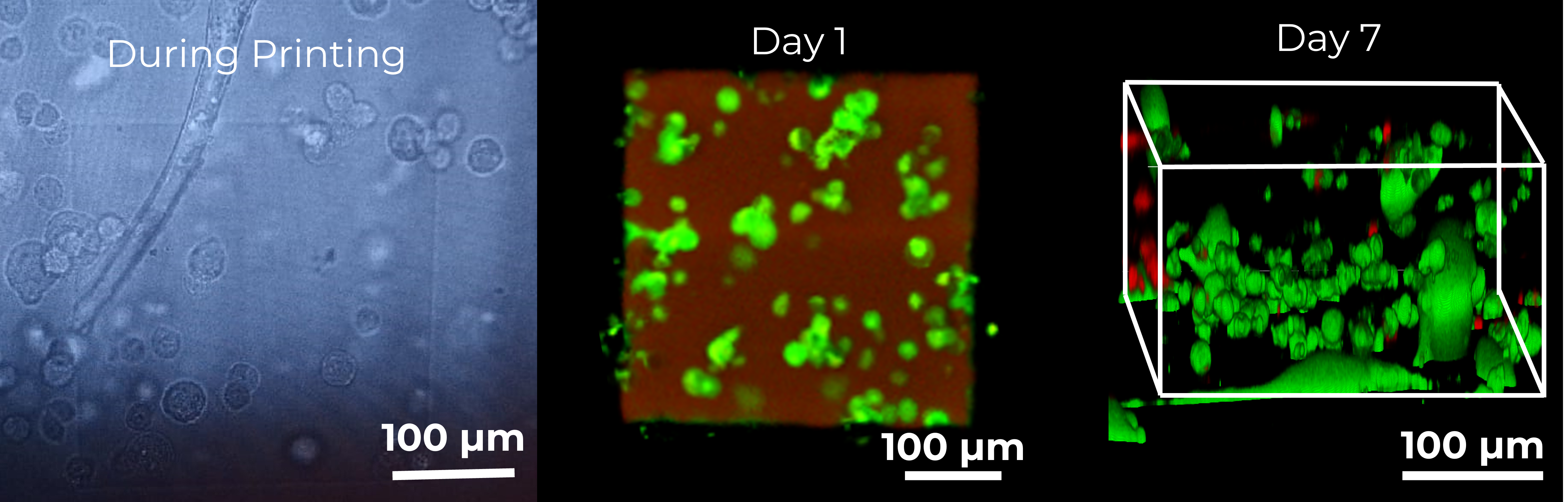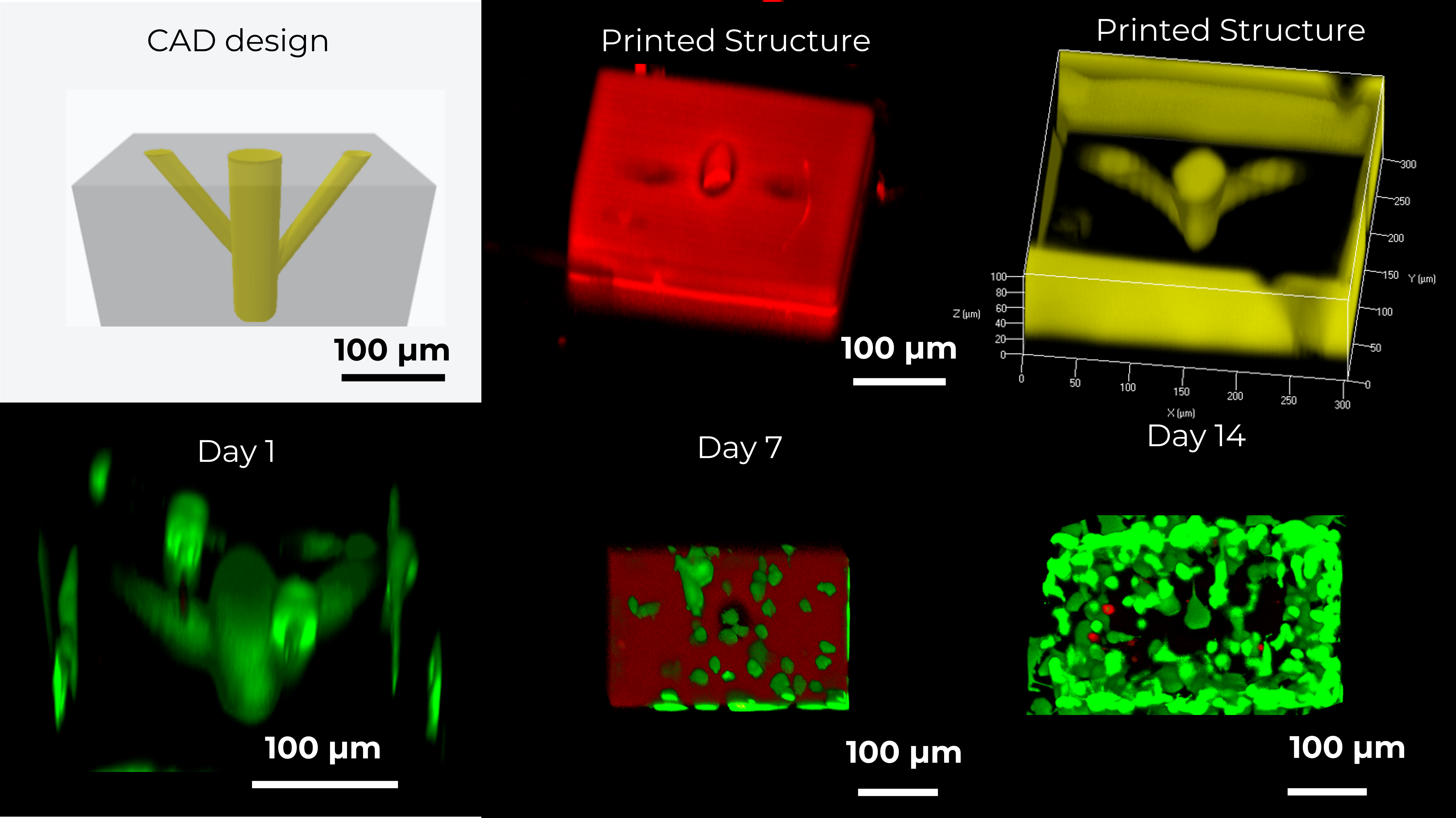 Live cell printing at the microscale: Printing of a microstructure in the presence of fibroblast cells on a Nanoscribe Photonic Professional GT2 system: during printing, after 1 day of cell culture and after 7 days of culture (green cells are alive, red cells are dead).