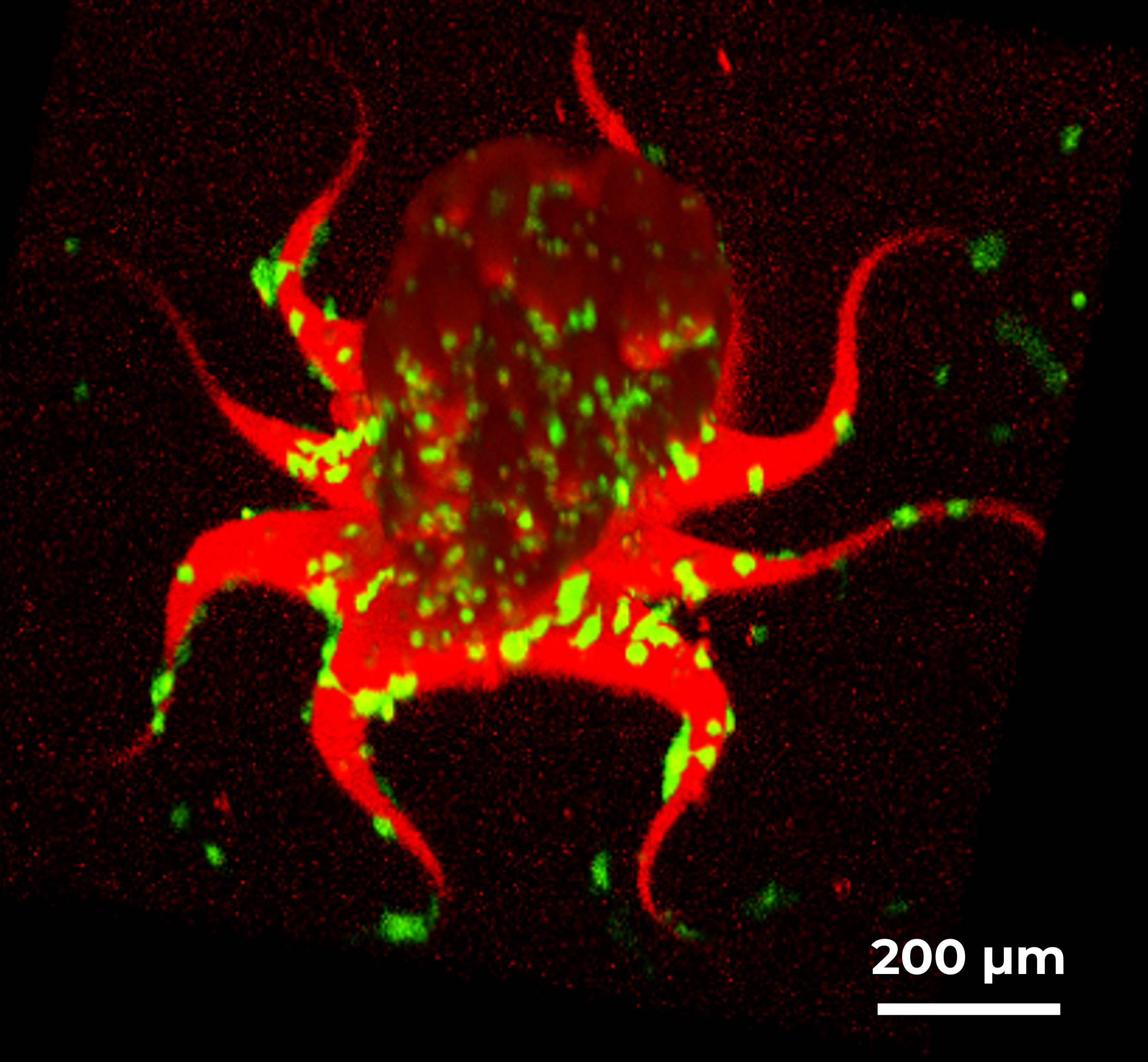 A tiny octopus, printed using the new resin in the presence of fibrosarcoma cells.