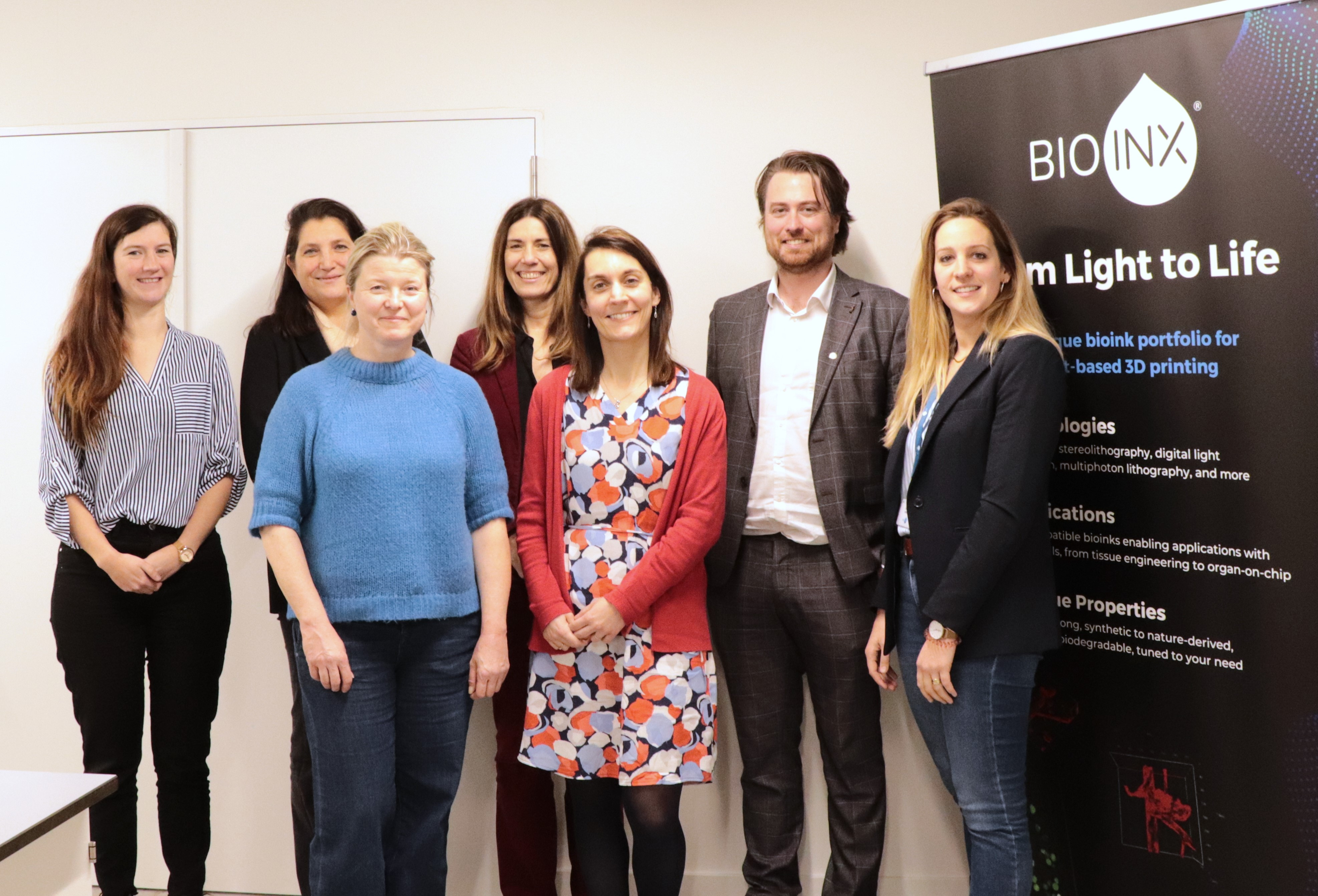 A Rousselot Biomedical delegation visiting the labs of BIO INX in Ghent with (l to r): Julie Schockaert (BIO INX), Kathleen Jacobs (Rousselot), Isabel Vanhecke (Rousselot), Tanja Vervust (Rousselot), Lies De Smedt (Rousselot), Jasper Van Hoorick (BIO INX) and Coralie Gréant (BIO INX).