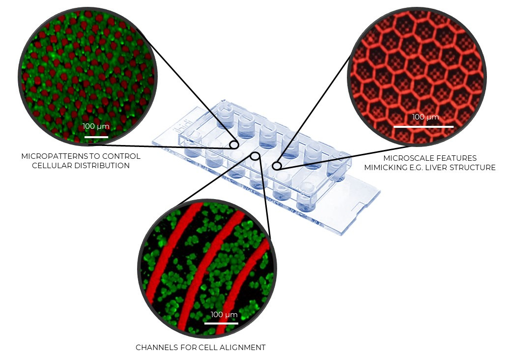 Different microstructures printed directly inside a microfluidic chip for drug discovery applications.