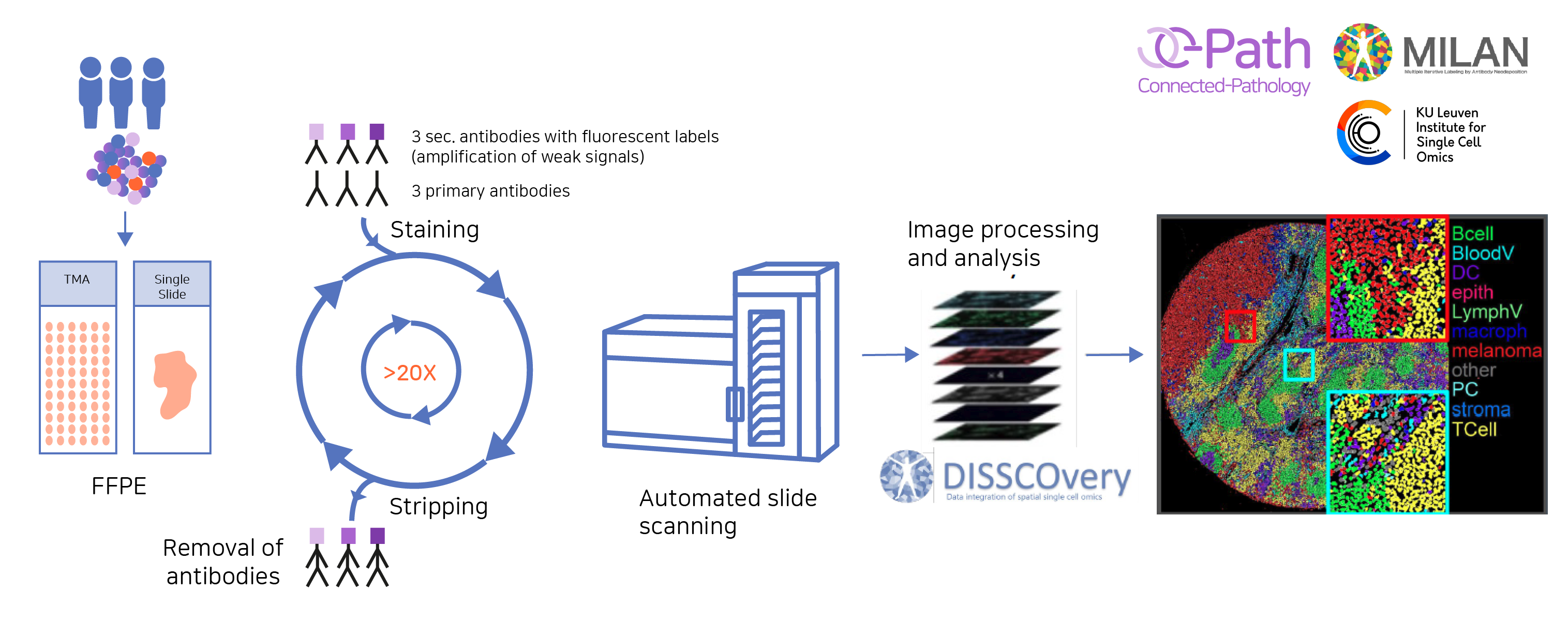 MILAN is a robust and versatile multiplex IHC method, allowing for whole-slide assessments. Equally, MILAN can be scaled down to the generation of tissue microarrays (TMA), enabling analysis of large cohorts in an efficient and affordable way.