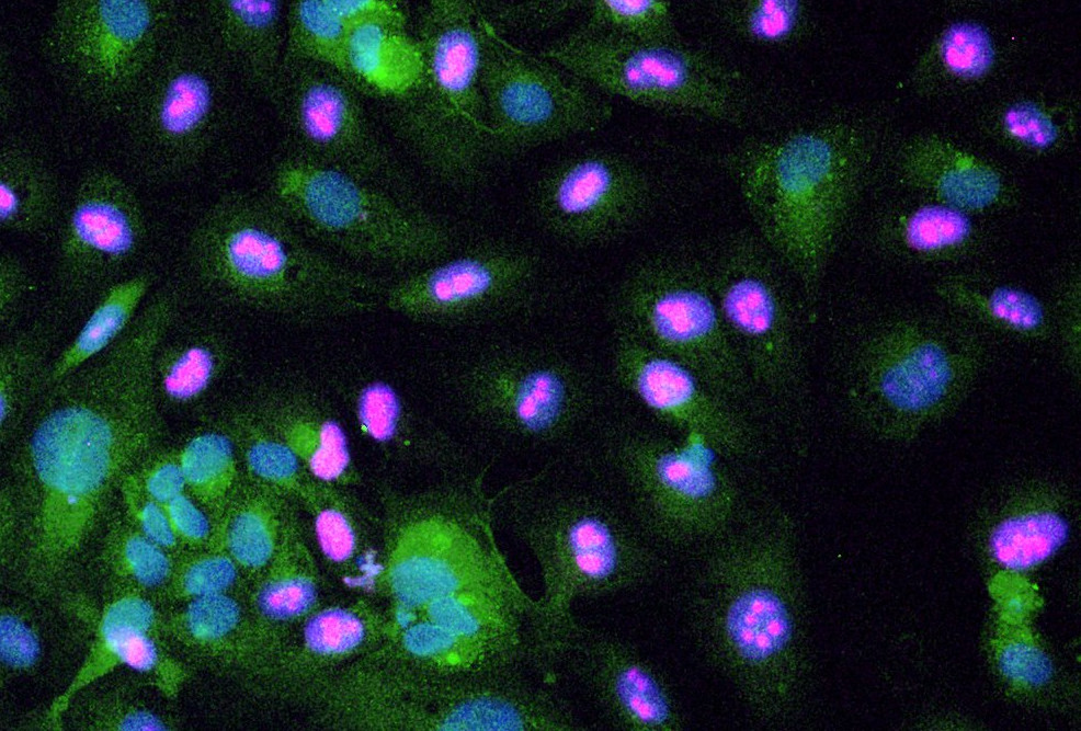 Expression of TRAIL (green) in proliferating (Ki-67+, magenta) and quiescent (Ki-67-) endothelial cells. Cell nuclei are shown in blue.