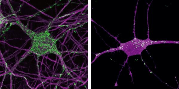 Mouse neurons (left) and a human neuron (right). Mitochondria displayed in green.